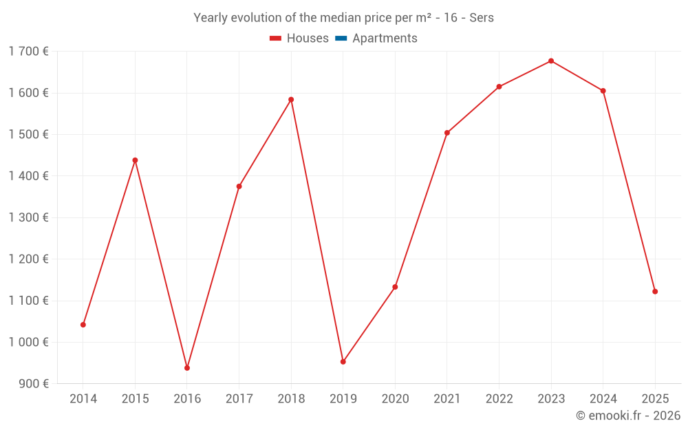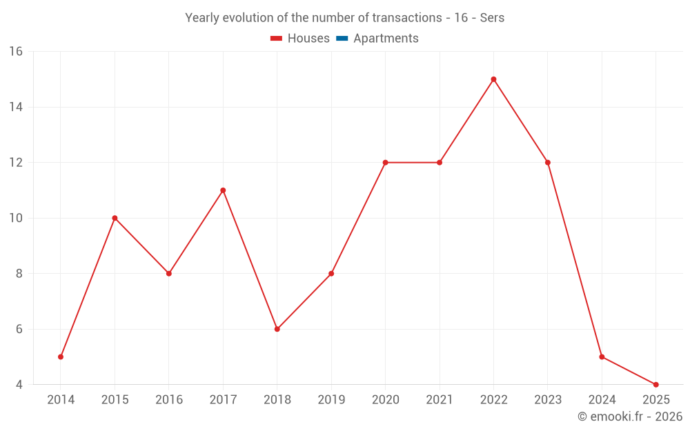 The median price on the 15 house transactions of the last 24 months in the municipality of Sers was 1 124 € per square meter for a median property value of 149 533 €. Over this period, 60% of transactions were between 666 and 1 897 € per square meter (from the 2nd to the 8th deciles).