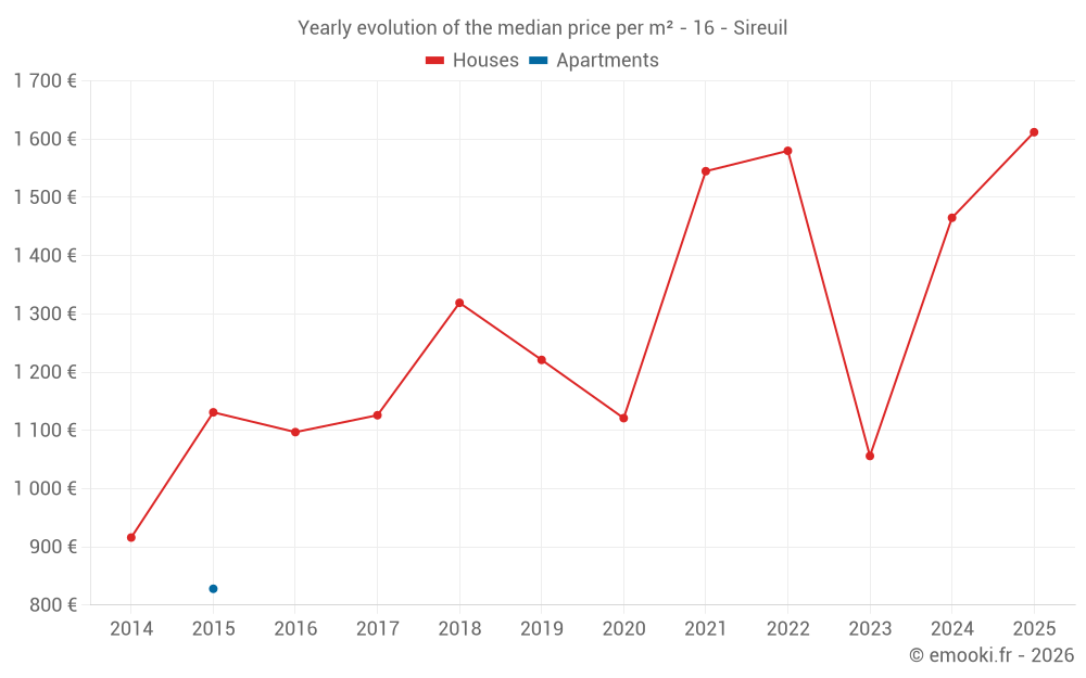 The median price on the 17 house transactions of the last 12 months in the municipality of Sireuil was 1 610 € per square meter for a median property value of 155 000 €. Over this period, 60% of transactions were between 1 284 and 2 037 € per square meter (from the 2nd to the 8th deciles).