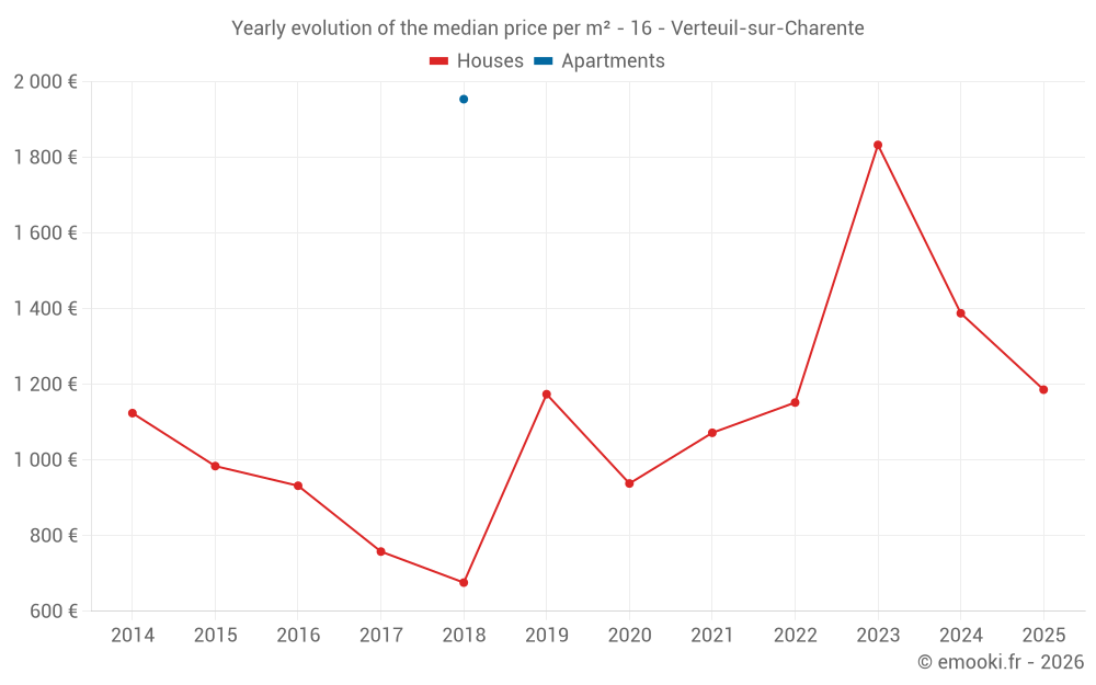 The median price on the 18 house transactions of the last 12 months in the municipality of Verteuil-sur-Charente was 1 203 € per square meter for a median property value of 122 025 €. Over this period, 60% of transactions were between 754 and 1 789 € per square meter (from the 2nd to the 8th deciles).