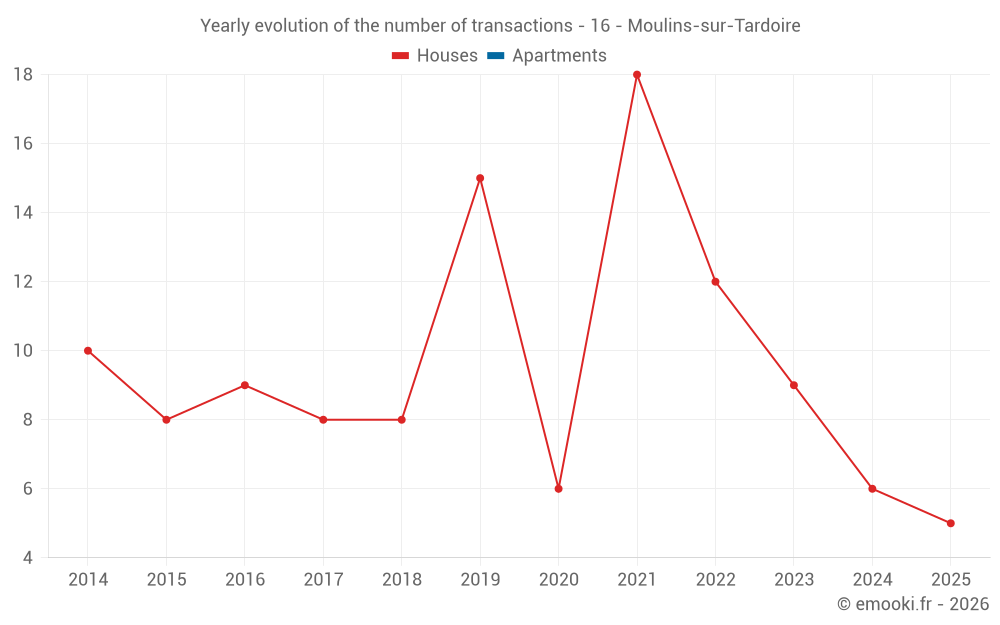 The median price on the 15 house transactions of the last 24 months in the municipality of Moulins-sur-Tardoire was 1 272 € per square meter for a median property value of 143 500 €. Over this period, 60% of transactions were between 928 and 1 601 € per square meter (from the 2nd to the 8th deciles).