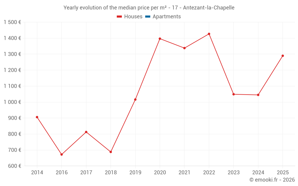 The median price on the 17 house transactions of the last 24 months in the municipality of Antezant-la-Chapelle was 1 090 € per square meter for a median property value of 100 000 €. Over this period, 60% of transactions were between 768 and 1 461 € per square meter (from the 2nd to the 8th deciles).