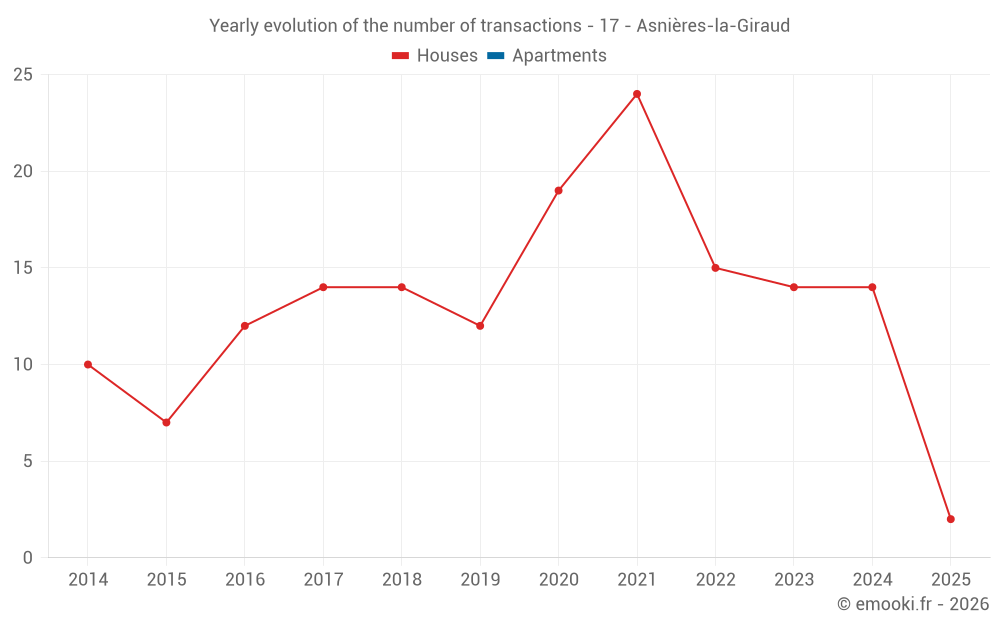 The median price on the 25 house transactions of the last 24 months in the municipality of Asnières-la-Giraud was 1 323 € per square meter for a median property value of 136 000 €. Over this period, 60% of transactions were between 870 and 2 002 € per square meter (from the 2nd to the 8th deciles).