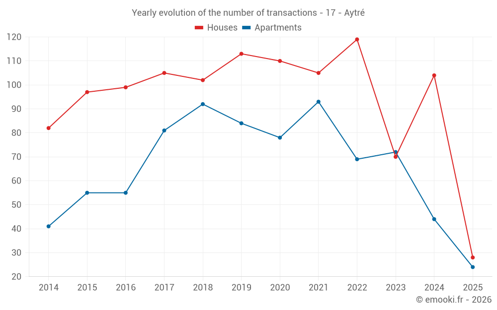 The median price on the 28 house transactions of the last 6 months in the municipality of Aytré was 3 358 € per square meter for a median property value of 293 776 €. Over this period, 60% of transactions were between 2 635 and 3 826 € per square meter (from the 2nd to the 8th deciles).