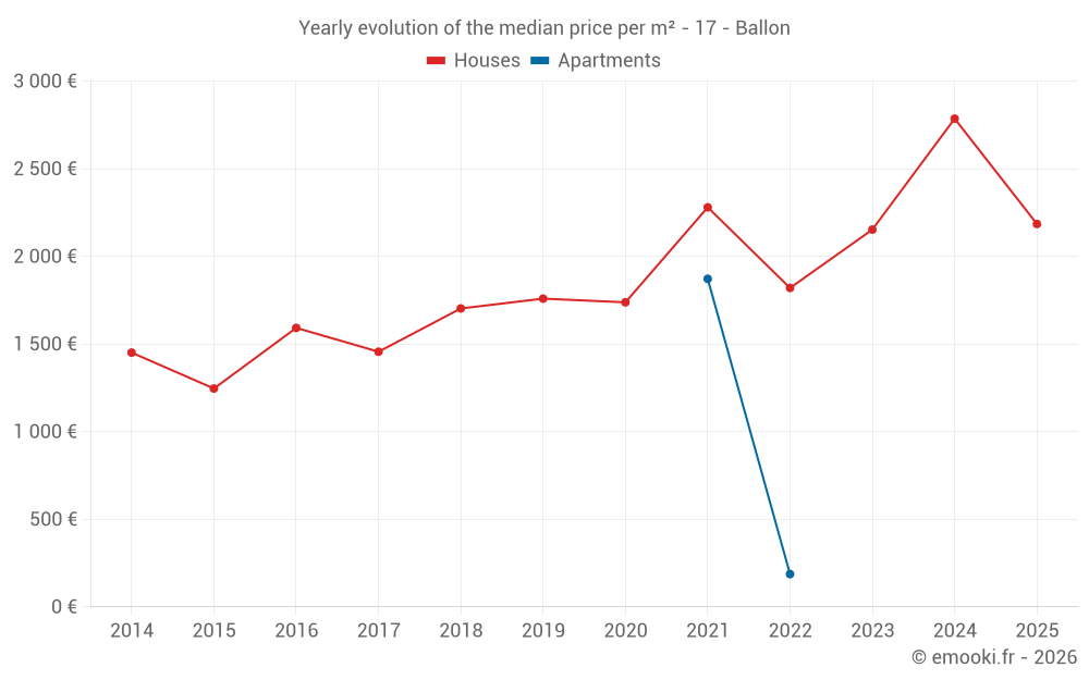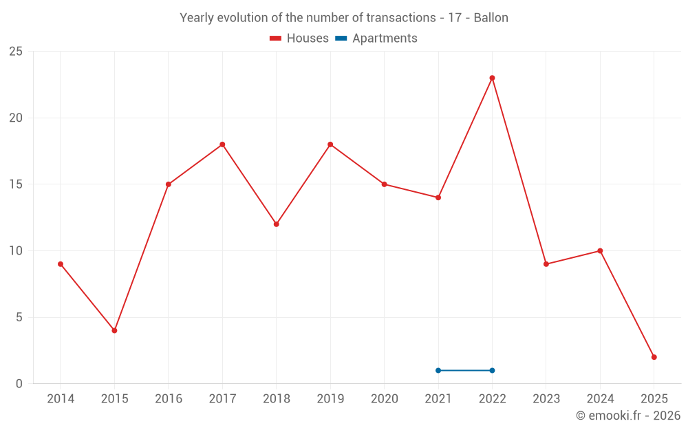 The median price on the 16 house transactions of the last 24 months in the municipality of Ballon was 2 786 € per square meter for a median property value of 264 138 €. Over this period, 60% of transactions were between 1 875 and 3 200 € per square meter (from the 2nd to the 8th deciles).