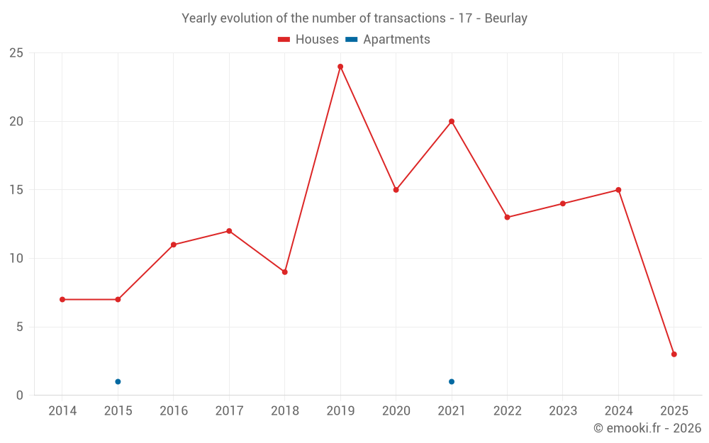 The median price on the 21 house transactions of the last 24 months in the municipality of Beurlay was 1 899 € per square meter for a median property value of 215 000 €. Over this period, 60% of transactions were between 925 and 2 323 € per square meter (from the 2nd to the 8th deciles).