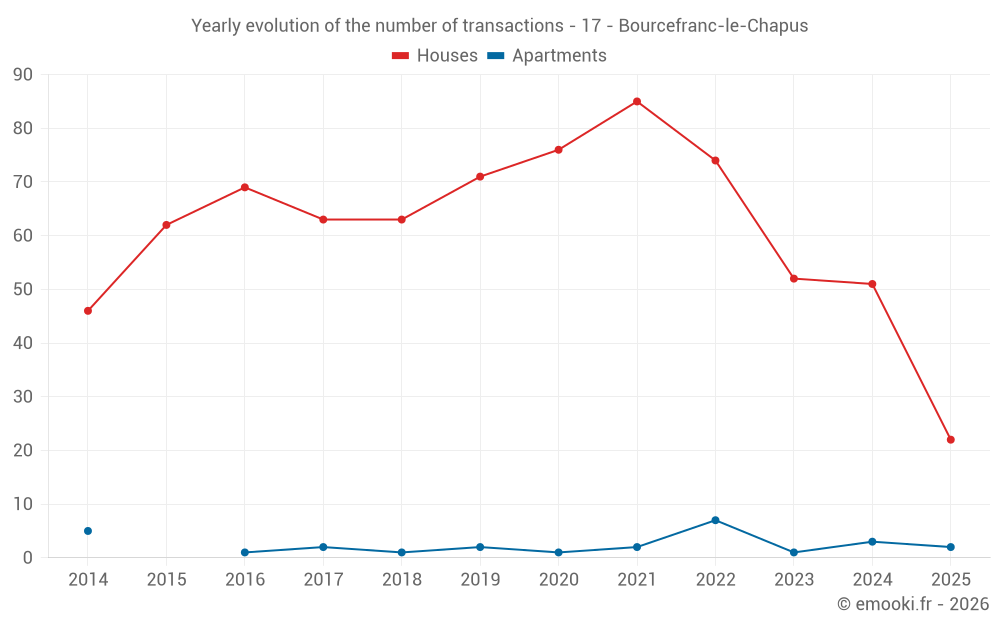 The median price on the 22 house transactions of the last 6 months in the municipality of Bourcefranc-le-Chapus was 2 635 € per square meter for a median property value of 232 600 €. Over this period, 60% of transactions were between 1 968 and 3 033 € per square meter (from the 2nd to the 8th deciles).