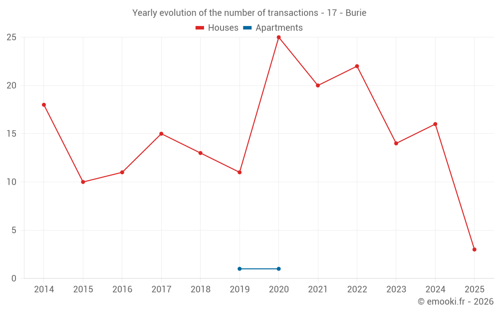 The median price on the 23 house transactions of the last 24 months in the municipality of Burie was 1 203 € per square meter for a median property value of 125 000 €. Over this period, 60% of transactions were between 1 018 and 1 782 € per square meter (from the 2nd to the 8th deciles).