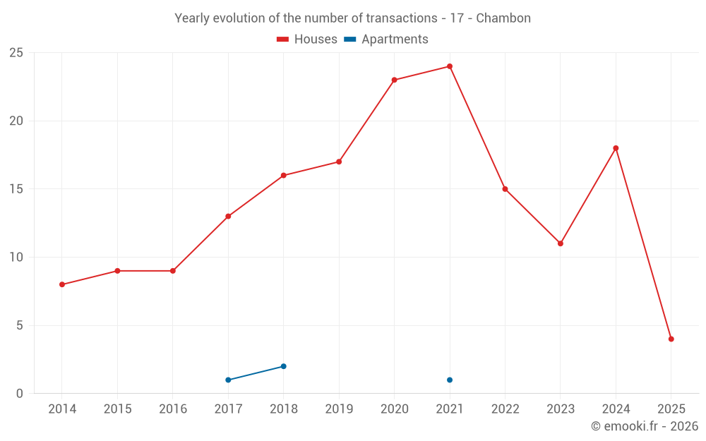The median price on the 30 house transactions of the last 24 months in the municipality of Chambon was 2 050 € per square meter for a median property value of 201 300 €. Over this period, 60% of transactions were between 1 336 and 2 773 € per square meter (from the 2nd to the 8th deciles).