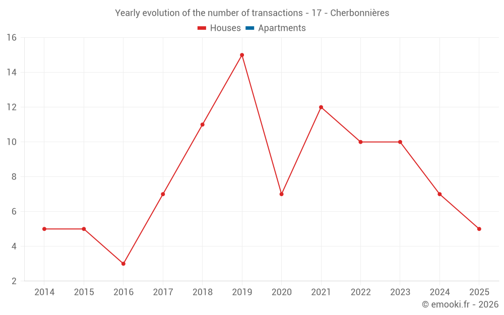 The median price on the 15 house transactions of the last 24 months in the municipality of Cherbonnières was 1 316 € per square meter for a median property value of 150 000 €. Over this period, 60% of transactions were between 815 and 1 678 € per square meter (from the 2nd to the 8th deciles).