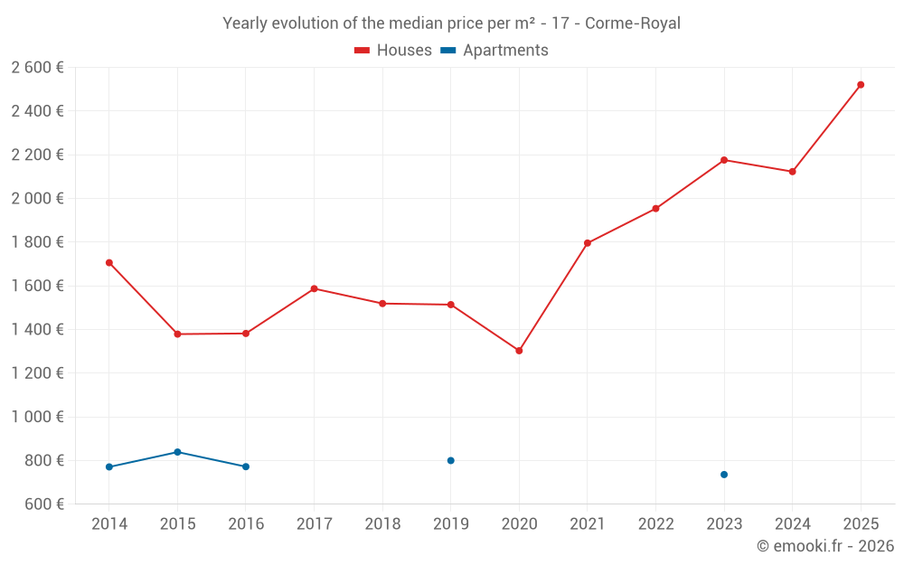 The median price on the 24 house transactions of the last 12 months in the municipality of Corme-Royal was 2 204 € per square meter for a median property value of 204 442 €. Over this period, 60% of transactions were between 1 744 and 2 678 € per square meter (from the 2nd to the 8th deciles).