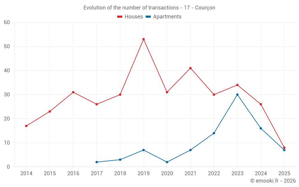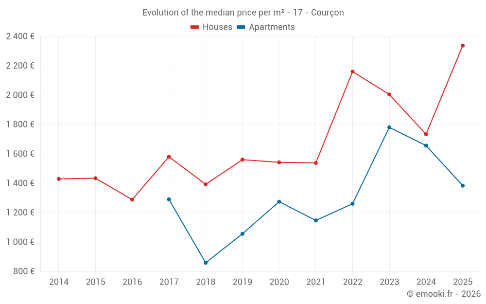 The median price on the 18 apartment transactions of the last 12 months in the municipality of Courçon was 1 500 € per square meter for a median property value of 71 125 €. Over this period, 60% of transactions were between 1 311 and 1 771 € per square meter (from the 2nd to the 8th deciles).