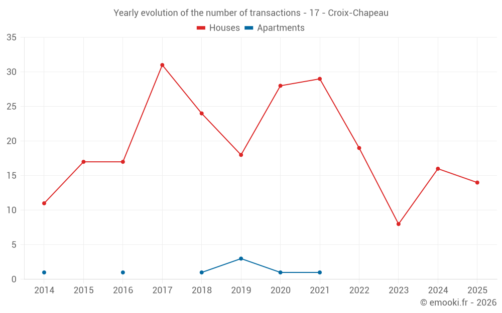 The median price on the 30 house transactions of the last 24 months in the municipality of Croix-Chapeau was 2 698 € per square meter for a median property value of 240 200 €. Over this period, 60% of transactions were between 2 150 and 3 160 € per square meter (from the 2nd to the 8th deciles).