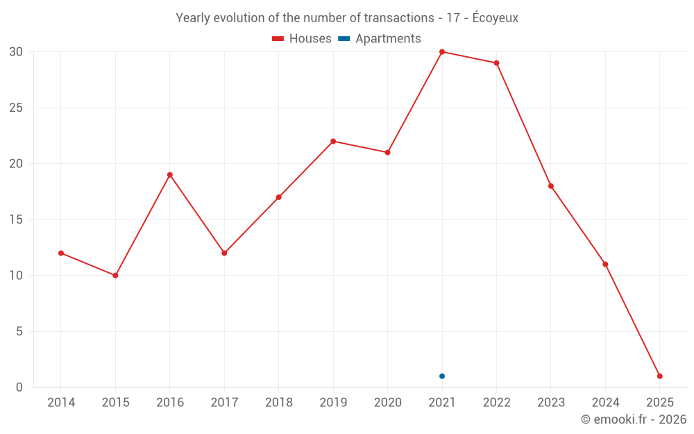 The median price on the 19 house transactions of the last 24 months in the municipality of Écoyeux was 1 594 € per square meter for a median property value of 150 000 €. Over this period, 60% of transactions were between 701 and 2 026 € per square meter (from the 2nd to the 8th deciles).