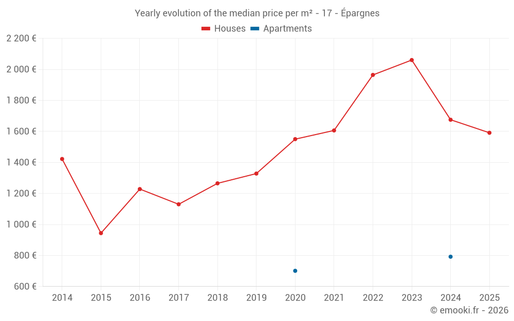 The median price on the 26 house transactions of the last 24 months in the municipality of Épargnes was 1 862 € per square meter for a median property value of 172 500 €. Over this period, 60% of transactions were between 1 000 and 2 403 € per square meter (from the 2nd to the 8th deciles).