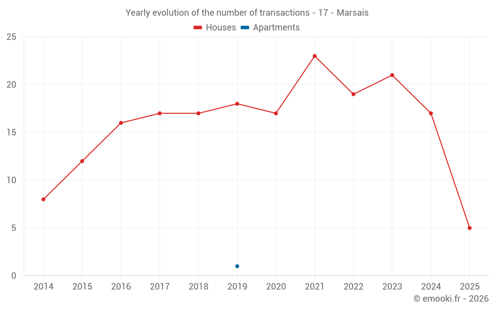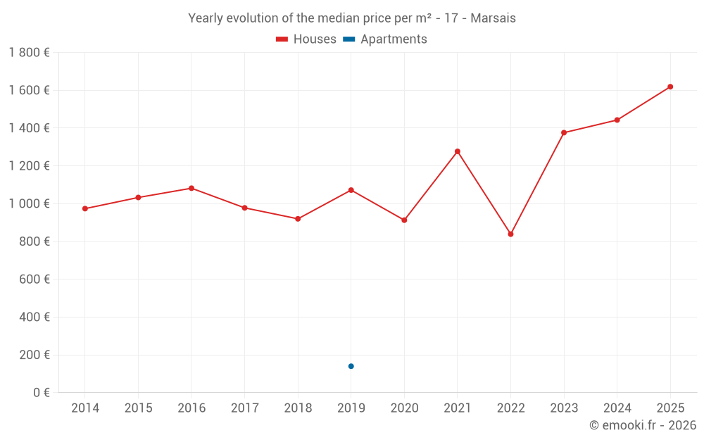 The median price on the 34 house transactions of the last 24 months in the municipality of Marsais was 1 396 € per square meter for a median property value of 155 695 €. Over this period, 60% of transactions were between 920 and 1 983 € per square meter (from the 2nd to the 8th deciles).