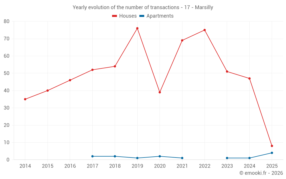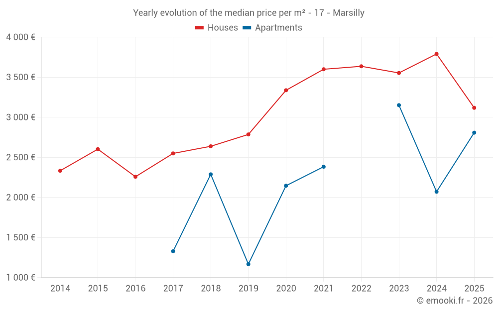 The median price on the 40 house transactions of the last 12 months in the municipality of Marsilly was 3 632 € per square meter for a median property value of 372 500 €. Over this period, 60% of transactions were between 2 904 and 4 709 € per square meter (from the 2nd to the 8th deciles).