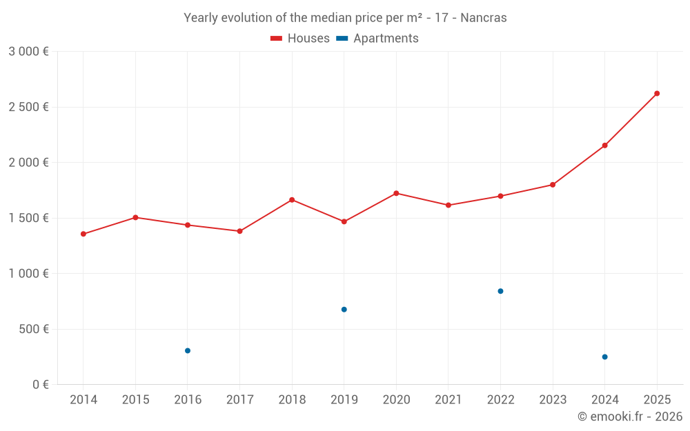 The median price on the 15 house transactions of the last 24 months in the municipality of Nancras was 2 082 € per square meter for a median property value of 190 000 €. Over this period, 60% of transactions were between 1 800 and 2 713 € per square meter (from the 2nd to the 8th deciles).