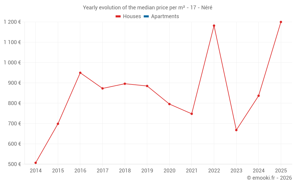The median price on the 31 house transactions of the last 24 months in the municipality of Néré was 938 € per square meter for a median property value of 100 000 €. Over this period, 60% of transactions were between 563 and 1 300 € per square meter (from the 2nd to the 8th deciles).