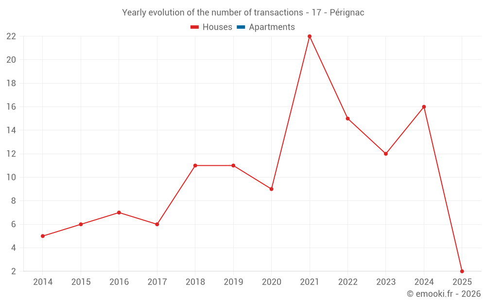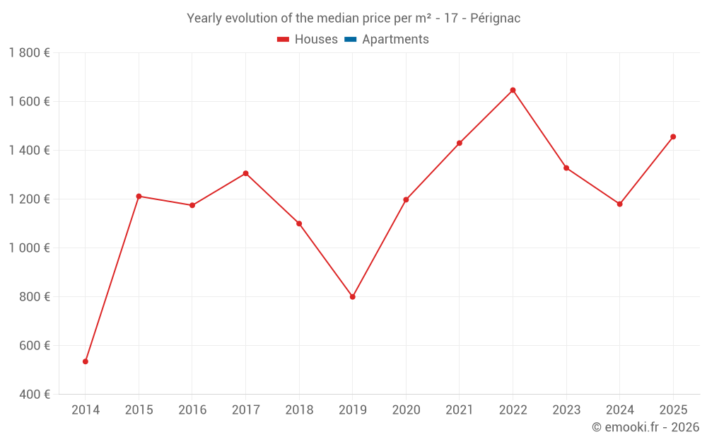 The median price on the 23 house transactions of the last 24 months in the municipality of Pérignac was 1 221 € per square meter for a median property value of 129 500 €. Over this period, 60% of transactions were between 771 and 1 569 € per square meter (from the 2nd to the 8th deciles).
