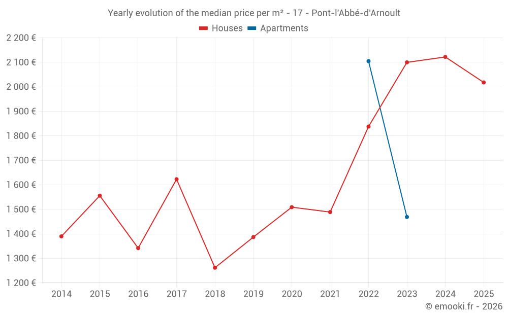 The median price on the 19 house transactions of the last 12 months in the municipality of Pont-l'Abbé-d'Arnoult was 2 093 € per square meter for a median property value of 193 390 €. Over this period, 60% of transactions were between 1 439 and 2 423 € per square meter (from the 2nd to the 8th deciles).