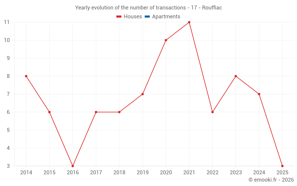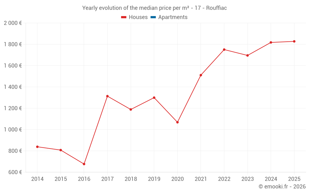 The median price on the 16 house transactions of the last 24 months in the municipality of Rouffiac was 1 783 € per square meter for a median property value of 169 000 €. Over this period, 60% of transactions were between 1 373 and 1 954 € per square meter (from the 2nd to the 8th deciles).