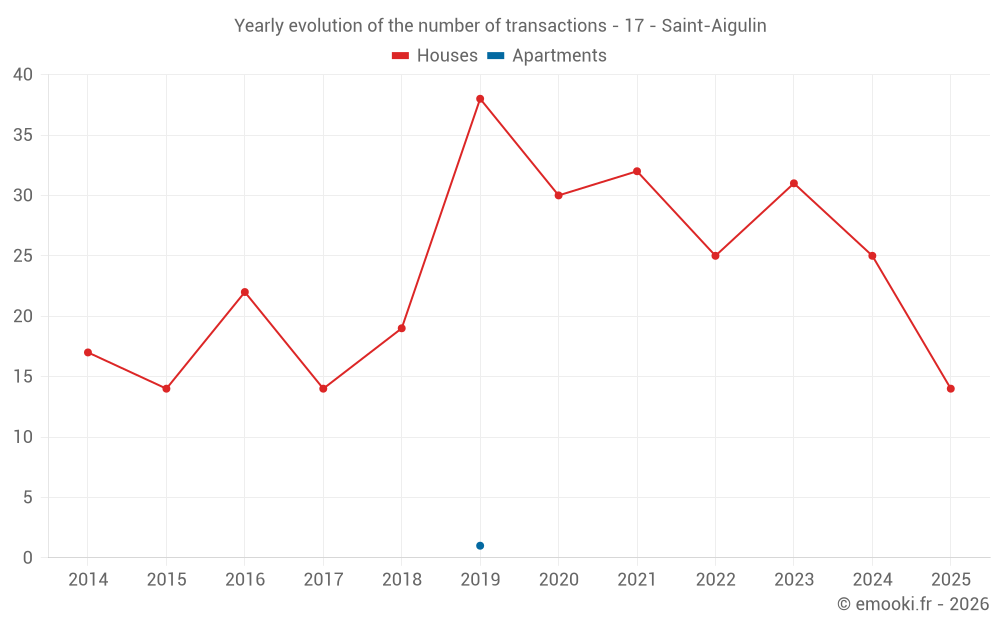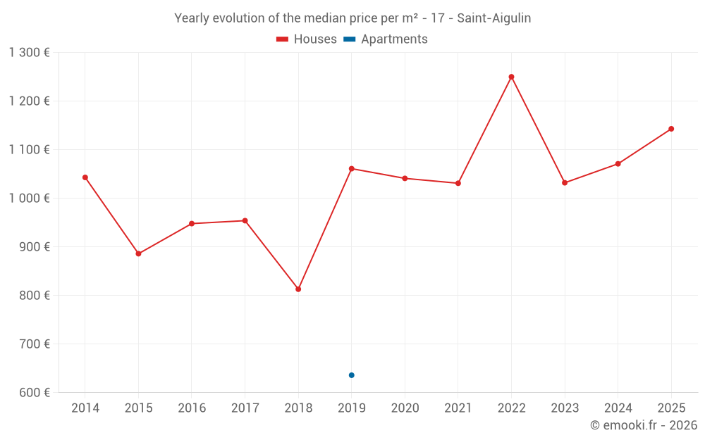 The median price on the 31 house transactions of the last 12 months in the municipality of Saint-Aigulin was 1 071 € per square meter for a median property value of 99 000 €. Over this period, 60% of transactions were between 614 and 1 456 € per square meter (from the 2nd to the 8th deciles).