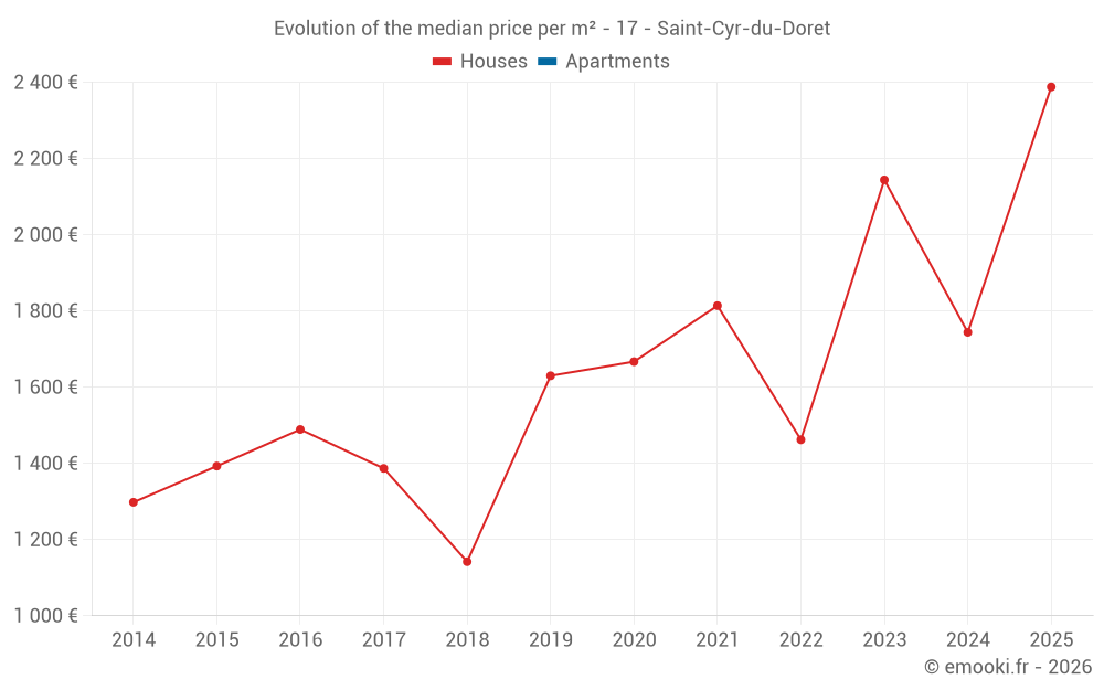 The median price on the 15 house transactions of the last 24 months in the municipality of Saint-Cyr-du-Doret was 1 935 € per square meter for a median property value of 184 050 €. Over this period, 60% of transactions were between 1 481 and 2 474 € per square meter (from the 2nd to the 8th deciles).