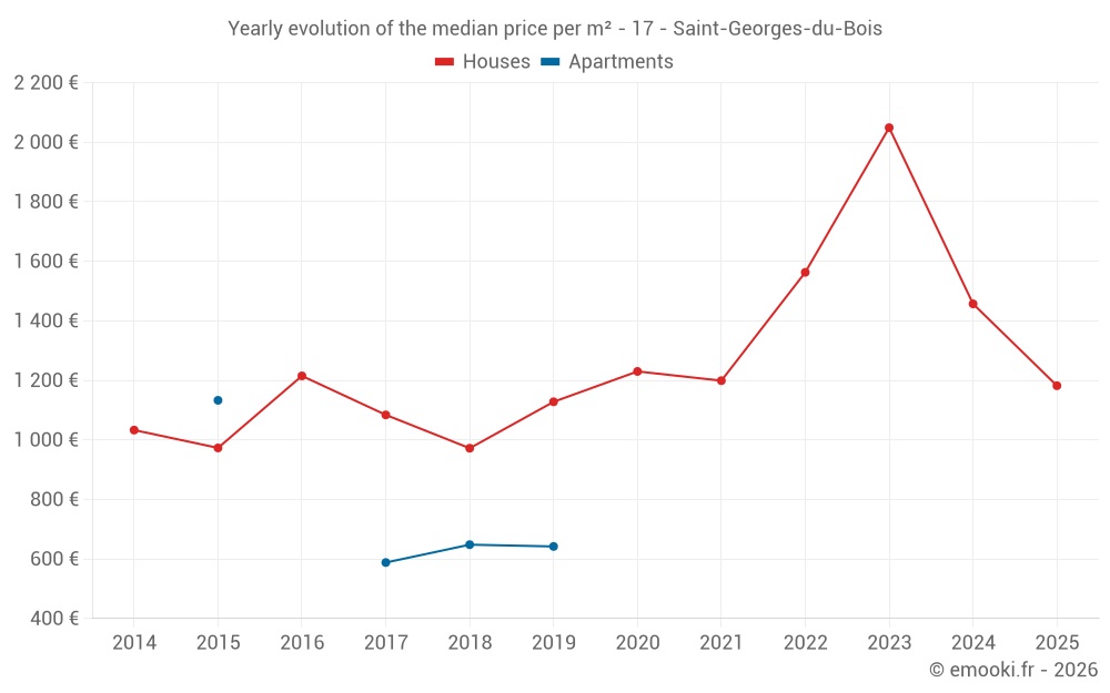 The median price on the 22 house transactions of the last 12 months in the municipality of Saint-Georges-du-Bois was 1 298 € per square meter for a median property value of 149 000 €. Over this period, 60% of transactions were between 795 and 1 951 € per square meter (from the 2nd to the 8th deciles).