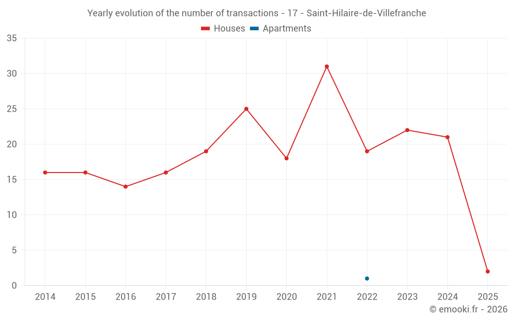The median price on the 17 house transactions of the last 12 months in the municipality of Saint-Hilaire-de-Villefranche was 1 400 € per square meter for a median property value of 140 000 €. Over this period, 60% of transactions were between 911 and 1 921 € per square meter (from the 2nd to the 8th deciles).