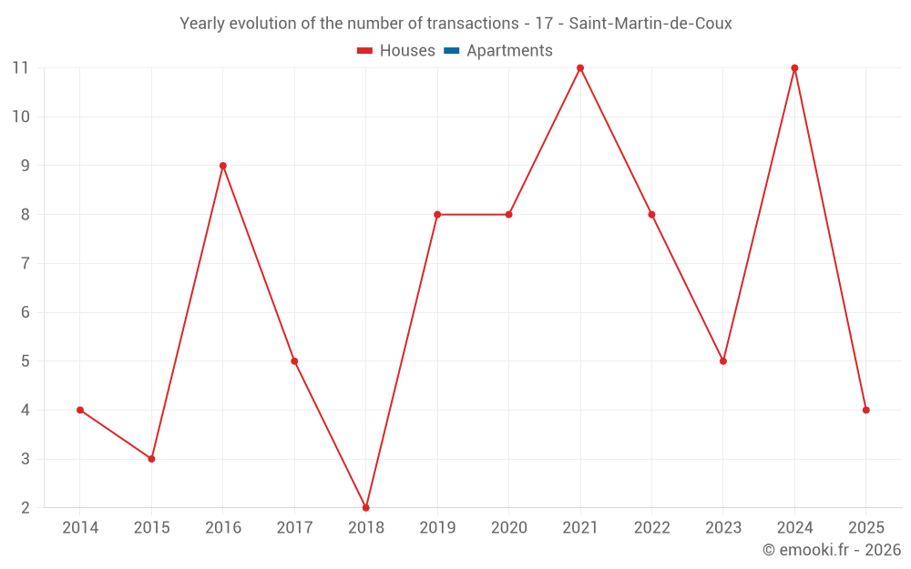 The median price on the 17 house transactions of the last 24 months in the municipality of Saint-Martin-de-Coux was 1 265 € per square meter for a median property value of 172 000 €. Over this period, 60% of transactions were between 862 and 1 850 € per square meter (from the 2nd to the 8th deciles).