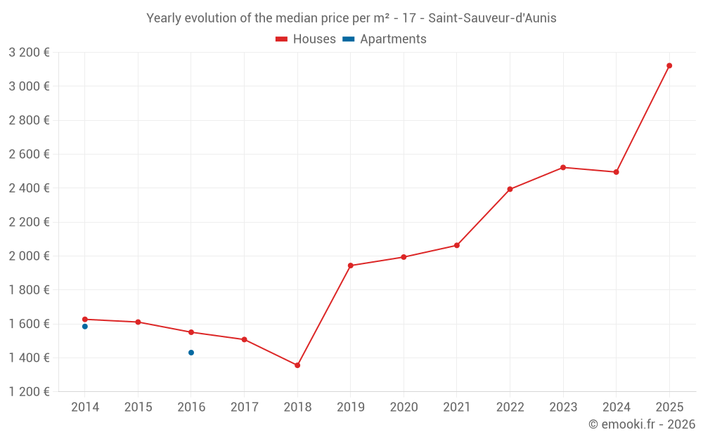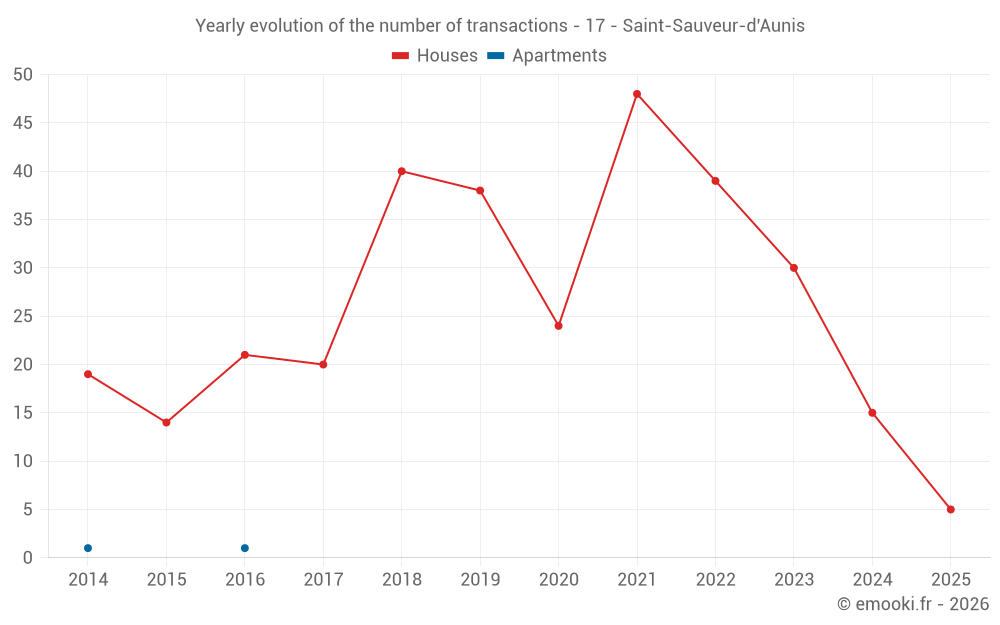 The median price on the 30 house transactions of the last 24 months in the municipality of Saint-Sauveur-d'Aunis was 2 574 € per square meter for a median property value of 259 820 €. Over this period, 60% of transactions were between 1 529 and 2 964 € per square meter (from the 2nd to the 8th deciles).