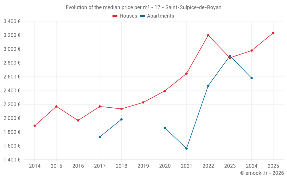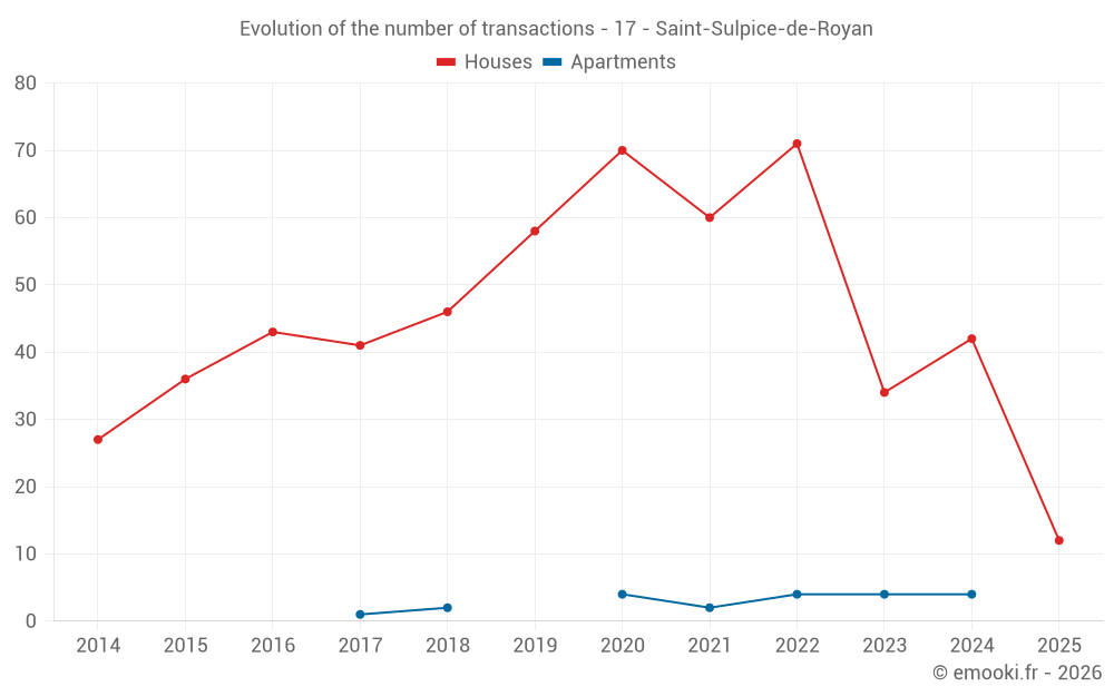 The median price on the 36 house transactions of the last 12 months in the municipality of Saint-Sulpice-de-Royan was 3 020 € per square meter for a median property value of 297 975 €. Over this period, 60% of transactions were between 2 454 and 3 499 € per square meter (from the 2nd to the 8th deciles).