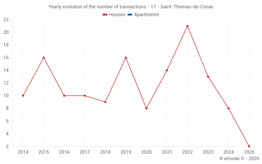 The median price on the 19 house transactions of the last 24 months in the municipality of Saint-Thomas-de-Conac was 1 241 € per square meter for a median property value of 158 000 €. Over this period, 60% of transactions were between 920 and 1 880 € per square meter (from the 2nd to the 8th deciles).