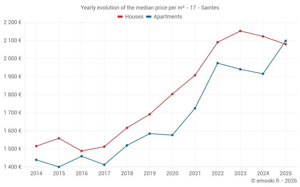 The median price on the 85 house transactions of the last 6 months in the municipality of Saintes was 2 079 € per square meter for a median property value of 180 564 €. Over this period, 60% of transactions were between 1 385 and 2 602 € per square meter (from the 2nd to the 8th deciles).