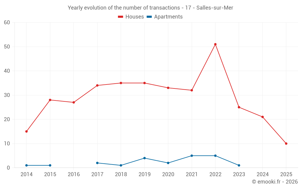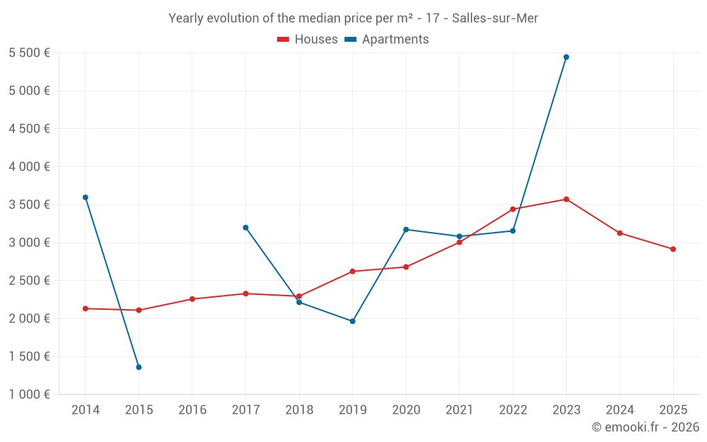 The median price on the 22 house transactions of the last 12 months in the municipality of Salles-sur-Mer was 2 914 € per square meter for a median property value of 275 750 €. Over this period, 60% of transactions were between 2 289 and 3 593 € per square meter (from the 2nd to the 8th deciles).