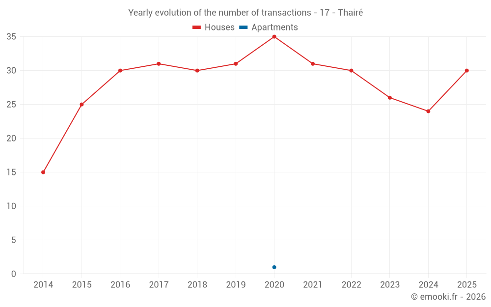 The median price on the 30 house transactions of the last 12 months in the municipality of Thairé was 2 959 € per square meter for a median property value of 247 350 €. Over this period, 60% of transactions were between 2 417 and 3 525 € per square meter (from the 2nd to the 8th deciles).