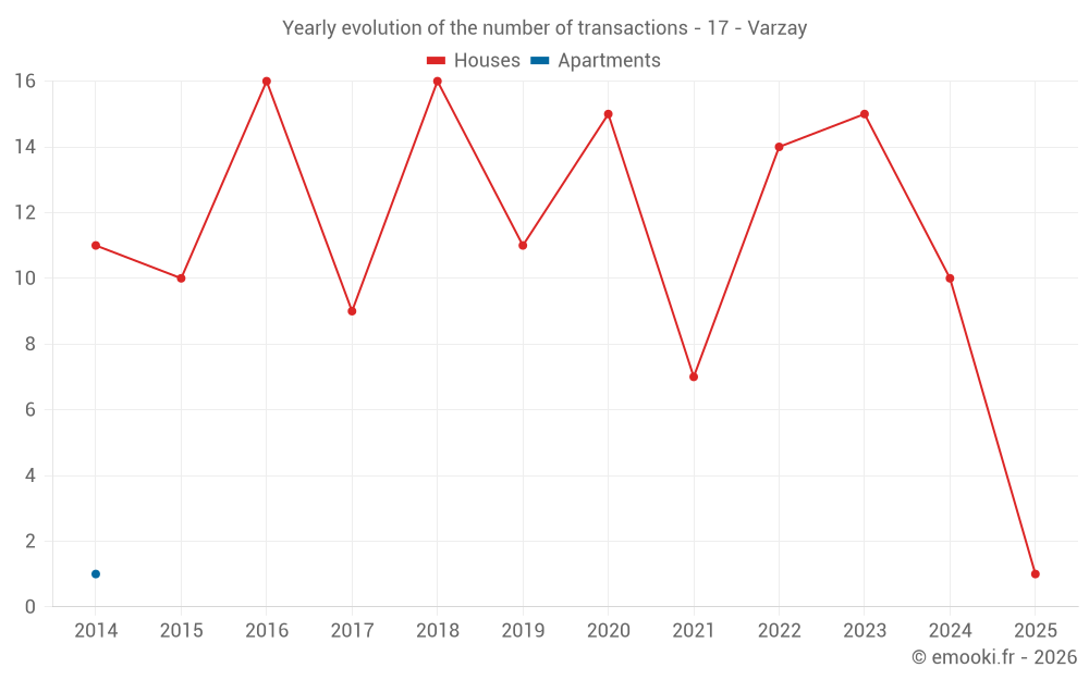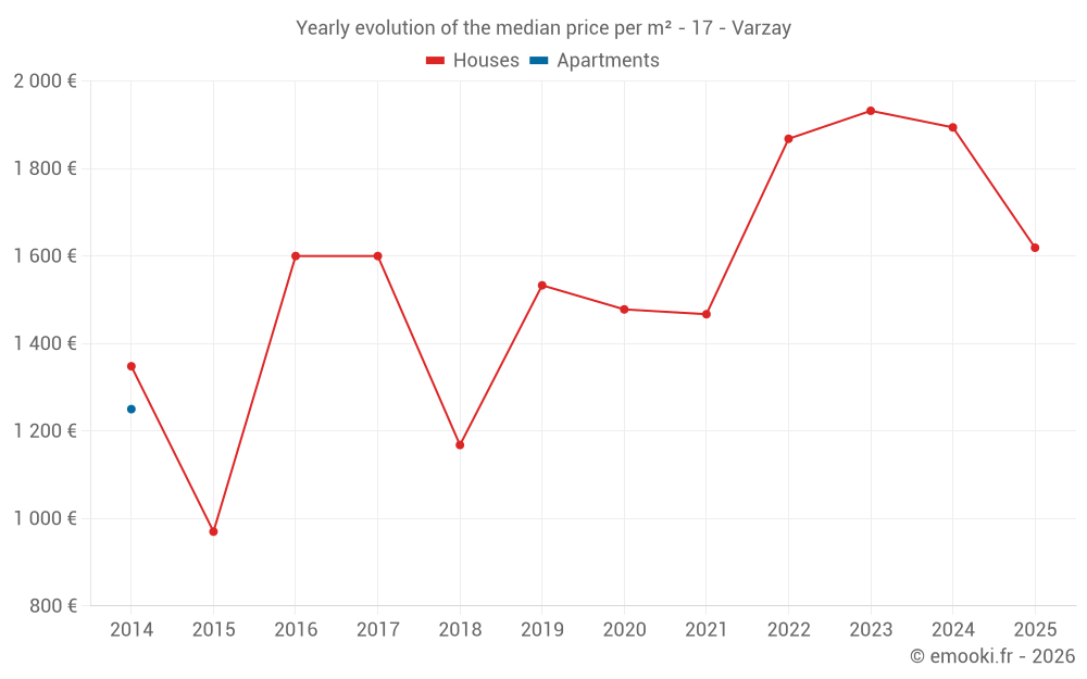 The median price on the 16 house transactions of the last 24 months in the municipality of Varzay was 1 860 € per square meter for a median property value of 172 050 €. Over this period, 60% of transactions were between 1 079 and 2 111 € per square meter (from the 2nd to the 8th deciles).