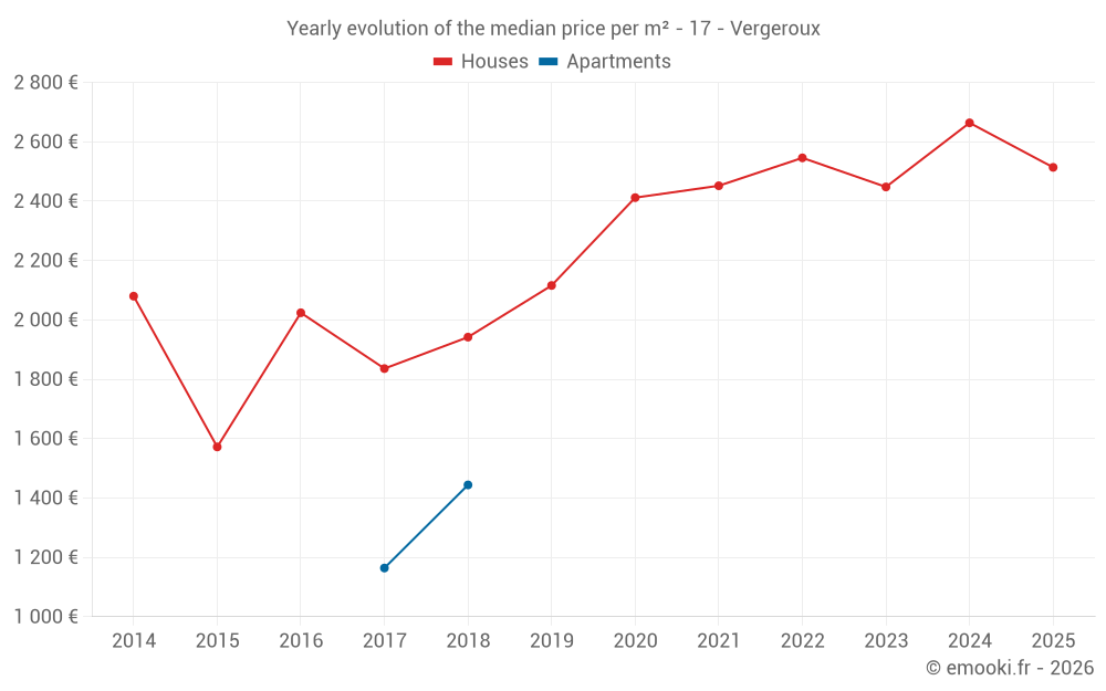 The median price on the 29 house transactions of the last 12 months in the municipality of Vergeroux was 2 661 € per square meter for a median property value of 272 000 €. Over this period, 60% of transactions were between 2 155 and 3 130 € per square meter (from the 2nd to the 8th deciles).