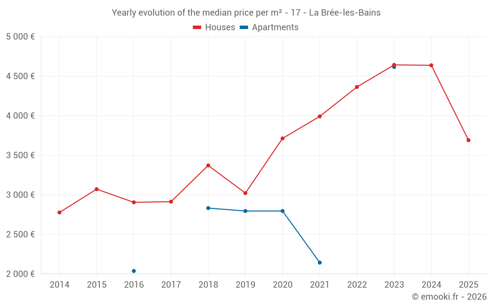 The median price on the 29 house transactions of the last 12 months in the municipality of La Brée-les-Bains was 4 484 € per square meter for a median property value of 285 000 €. Over this period, 60% of transactions were between 3 516 and 4 866 € per square meter (from the 2nd to the 8th deciles).