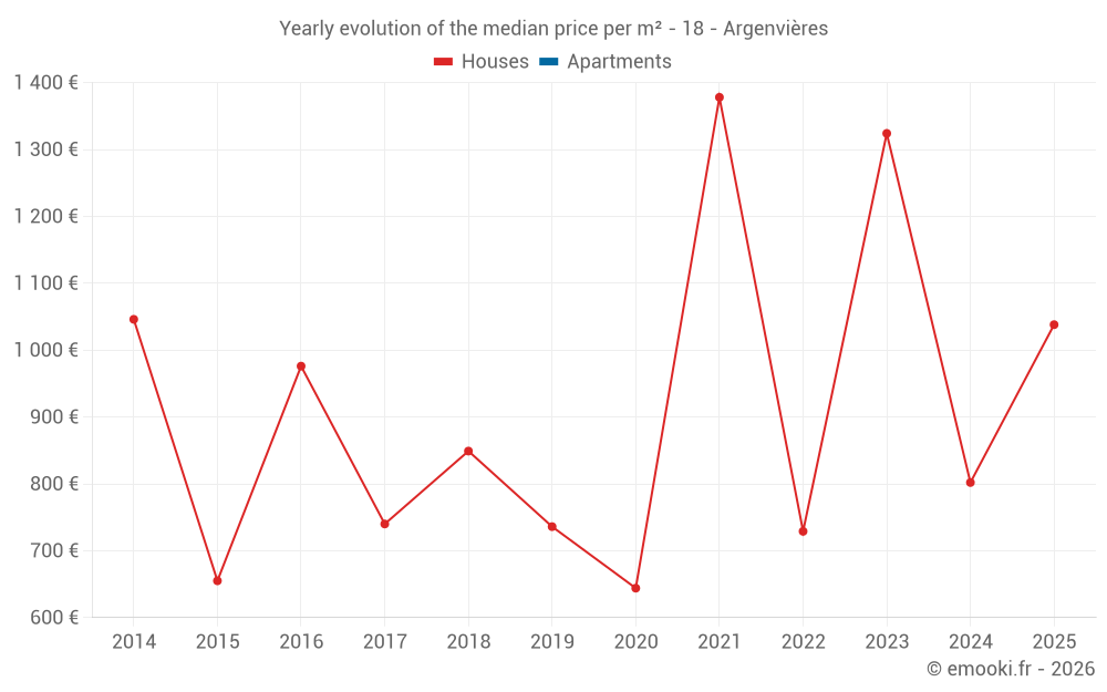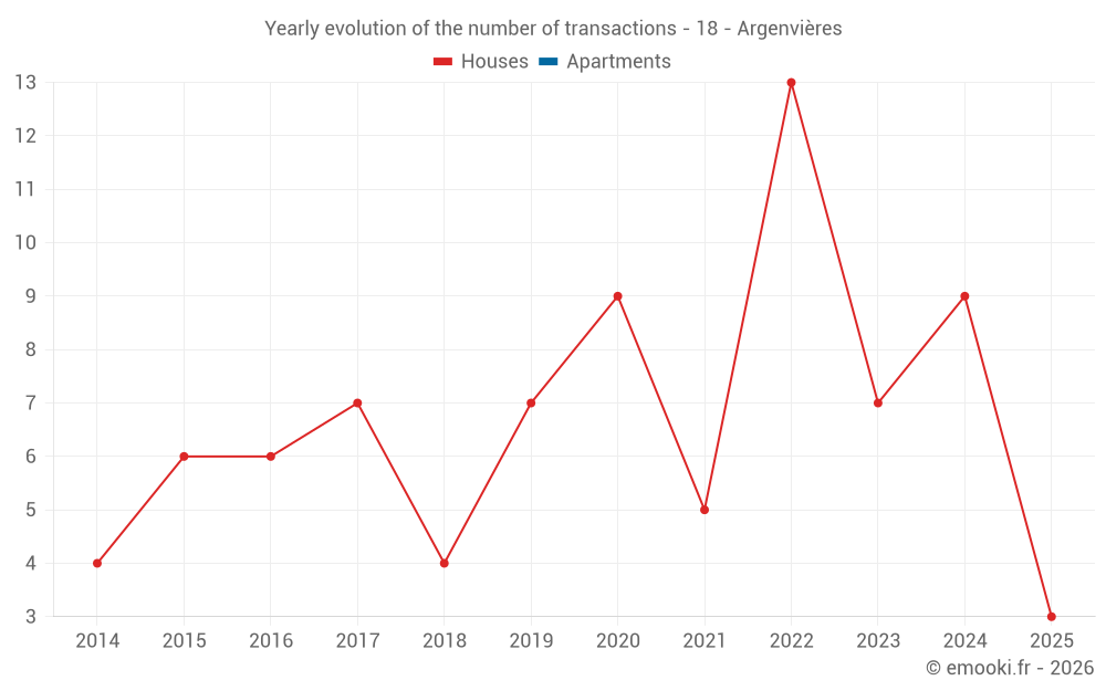 The median price on the 15 house transactions of the last 24 months in the municipality of Argenvières was 802 € per square meter for a median property value of 63 000 €. Over this period, 60% of transactions were between 579 and 1 120 € per square meter (from the 2nd to the 8th deciles).