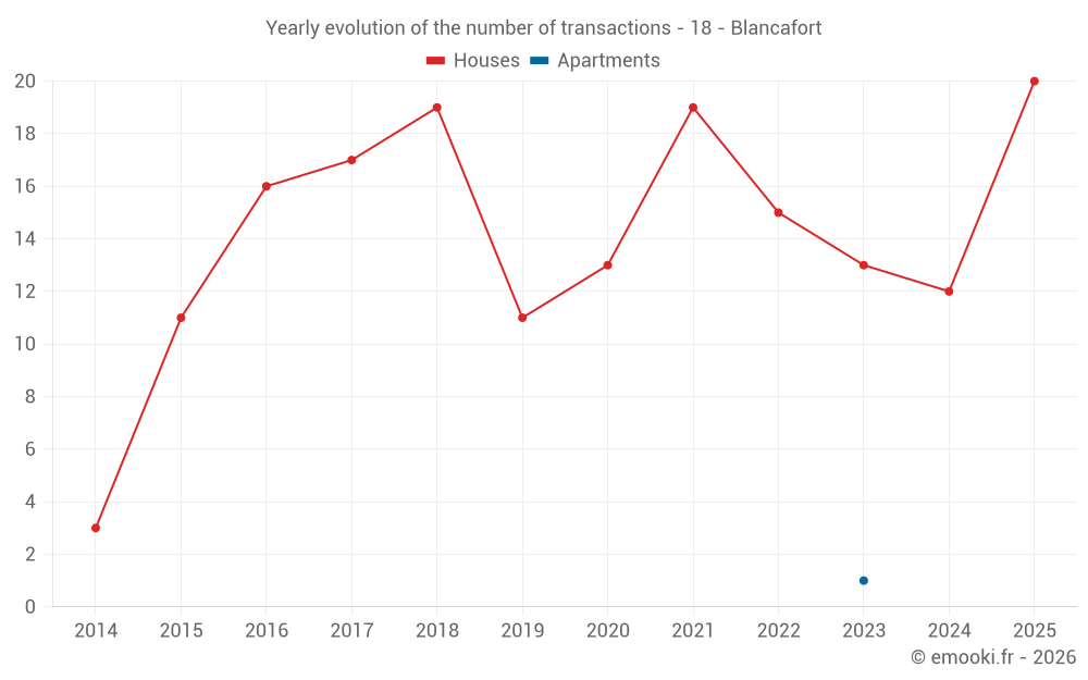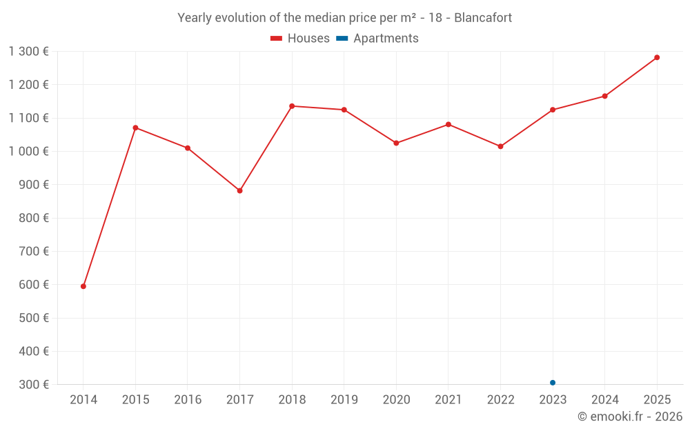 The median price on the 20 house transactions of the last 12 months in the municipality of Blancafort was 1 282 € per square meter for a median property value of 105 850 €. Over this period, 60% of transactions were between 618 and 1 781 € per square meter (from the 2nd to the 8th deciles).