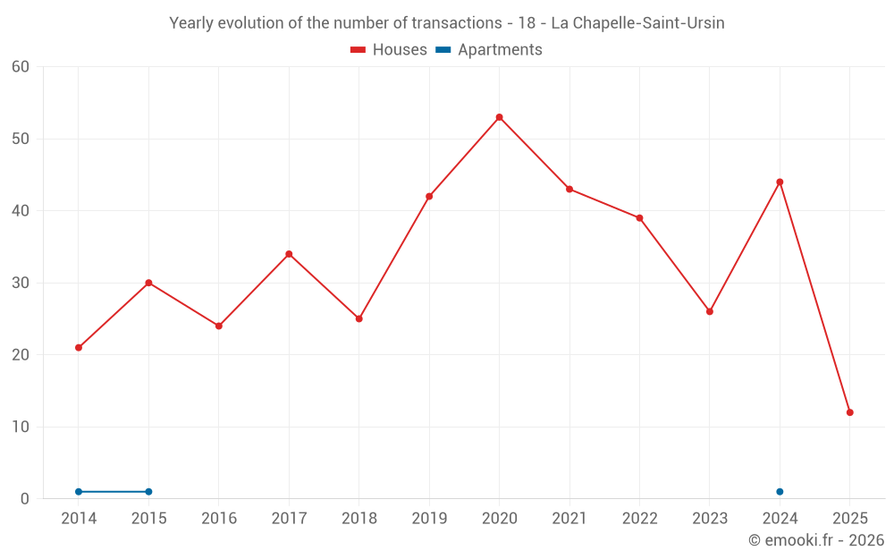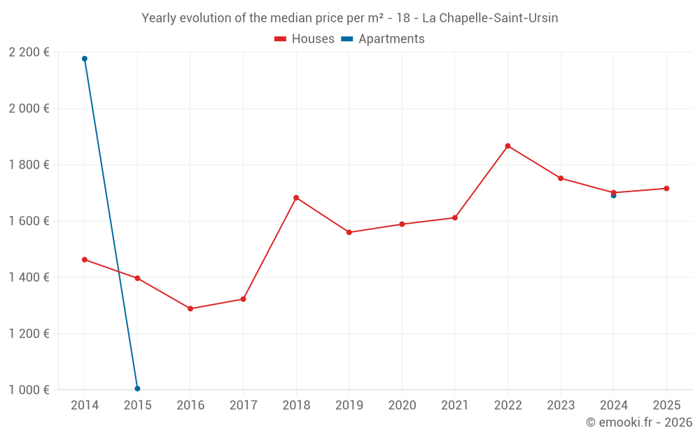 The median price on the 33 house transactions of the last 12 months in the municipality of La Chapelle-Saint-Ursin was 1 788 € per square meter for a median property value of 158 000 €. Over this period, 60% of transactions were between 1 269 and 2 109 € per square meter (from the 2nd to the 8th deciles).
