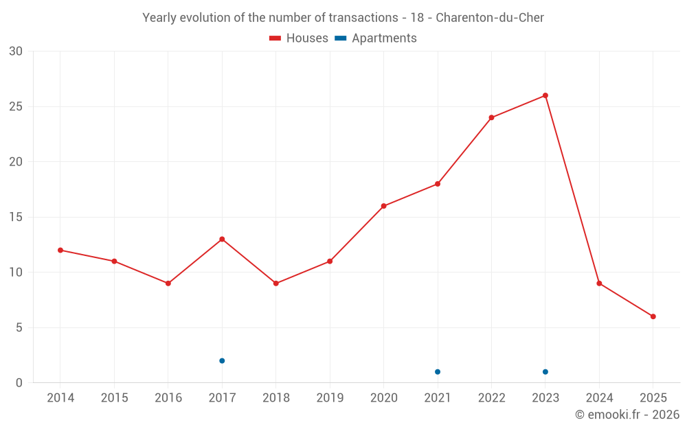 The median price on the 31 house transactions of the last 24 months in the municipality of Charenton-du-Cher was 733 € per square meter for a median property value of 71 000 €. Over this period, 60% of transactions were between 375 and 1 077 € per square meter (from the 2nd to the 8th deciles).
