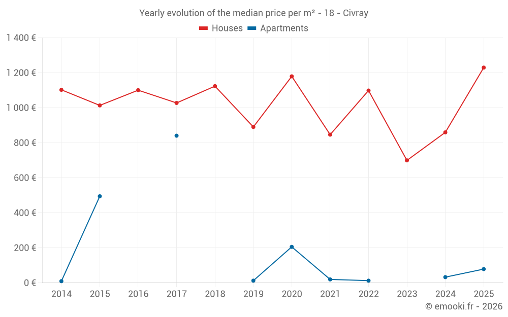 The median price on the 18 house transactions of the last 24 months in the municipality of Civray was 868 € per square meter for a median property value of 85 000 €. Over this period, 60% of transactions were between 535 and 1 202 € per square meter (from the 2nd to the 8th deciles).