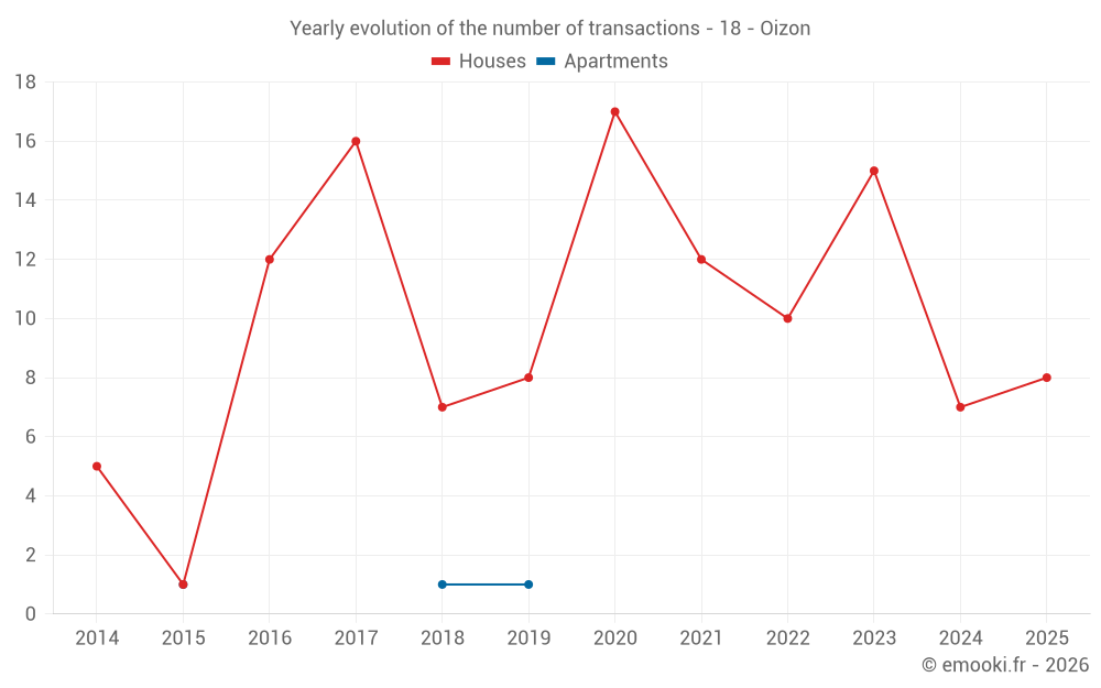 The median price on the 15 house transactions of the last 24 months in the municipality of Oizon was 1 169 € per square meter for a median property value of 130 000 €. Over this period, 60% of transactions were between 558 and 1 669 € per square meter (from the 2nd to the 8th deciles).