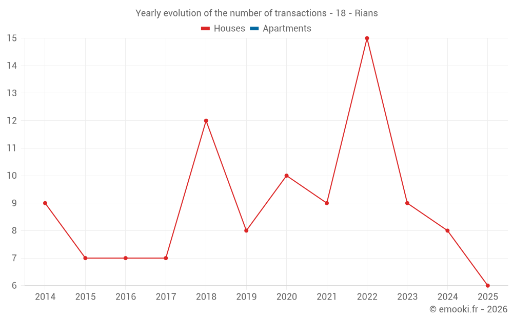 The median price on the 14 house transactions of the last 24 months in the municipality of Rians was 1 134 € per square meter for a median property value of 77 000 €. Over this period, 60% of transactions were between 882 and 1 318 € per square meter (from the 2nd to the 8th deciles).