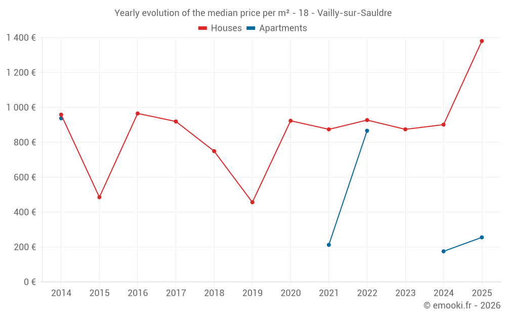 The median price on the 20 house transactions of the last 24 months in the municipality of Vailly-sur-Sauldre was 939 € per square meter for a median property value of 106 600 €. Over this period, 60% of transactions were between 607 and 1 253 € per square meter (from the 2nd to the 8th deciles).