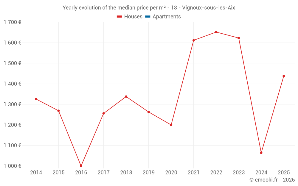 The median price on the 18 house transactions of the last 24 months in the municipality of Vignoux-sous-les-Aix was 1 220 € per square meter for a median property value of 130 000 €. Over this period, 60% of transactions were between 1 002 and 1 729 € per square meter (from the 2nd to the 8th deciles).