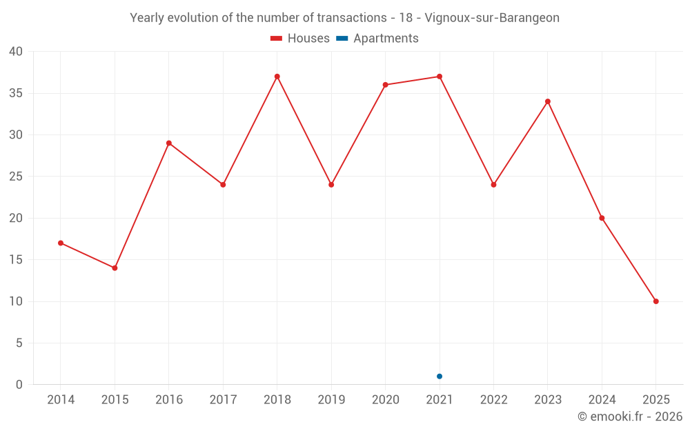 The median price on the 21 house transactions of the last 12 months in the municipality of Vignoux-sur-Barangeon was 1 474 € per square meter for a median property value of 134 000 €. Over this period, 60% of transactions were between 889 and 1 824 € per square meter (from the 2nd to the 8th deciles).