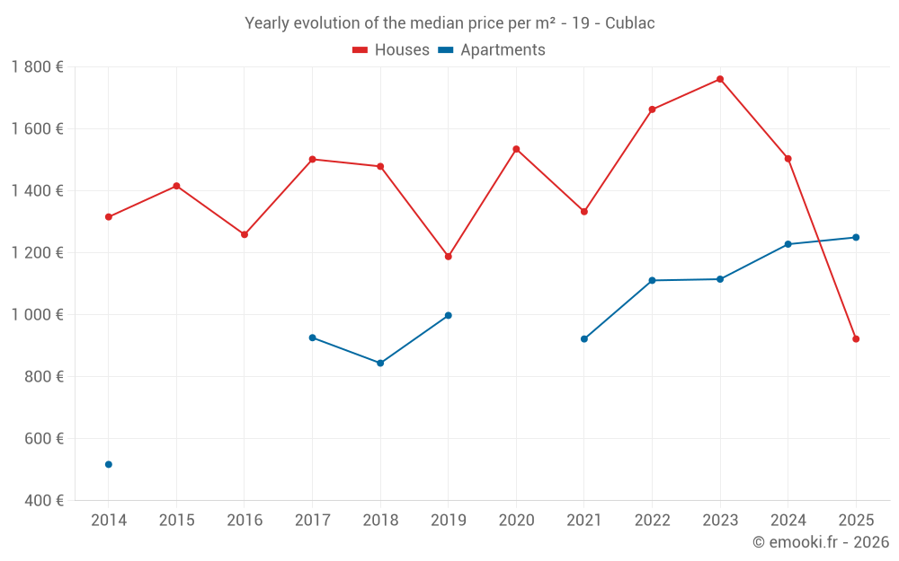 The median price on the 17 house transactions of the last 12 months in the municipality of Cublac was 1 370 € per square meter for a median property value of 158 800 €. Over this period, 60% of transactions were between 820 and 1 771 € per square meter (from the 2nd to the 8th deciles).